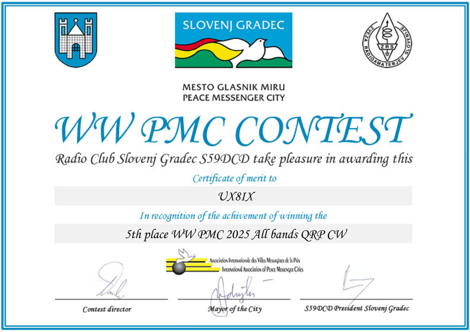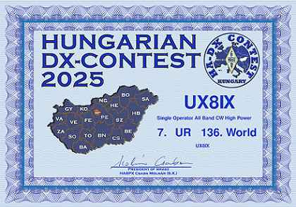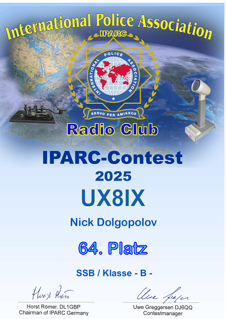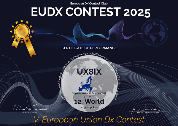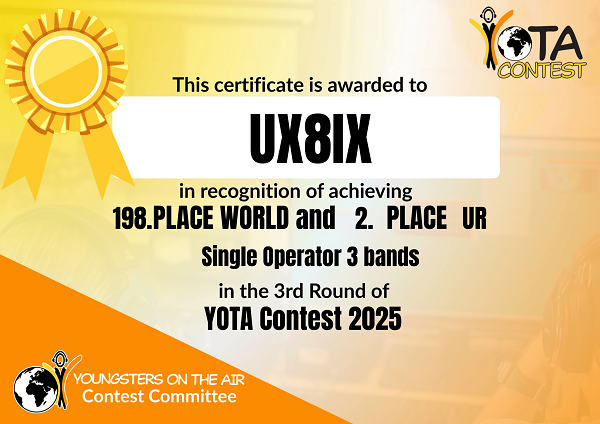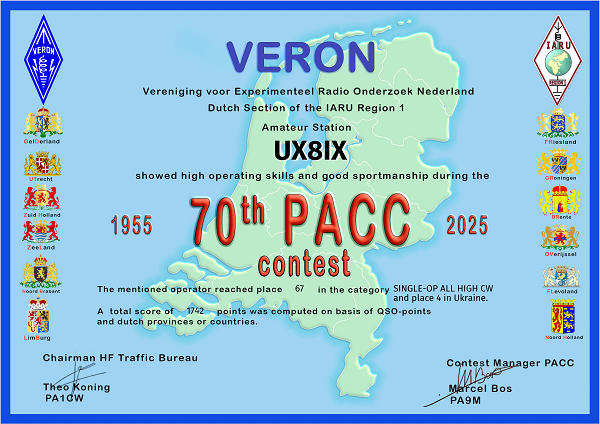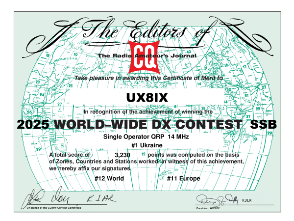 В 2025 году UX8IX отработал в 24 соревнованиях. В основном работал телеграфом на многодиапазонный диполь (14-28) расположенный на балконе 2 этажа. Вокруг 9-этажные дома... По мере получения новых дипломов за соревнования 2025 года, буду размещать на нашем сайте